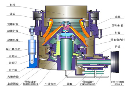 圓錐破碎機(jī)主要由機(jī)架、定錐總成、動錐總成、彈簧機(jī)構(gòu)、碗型軸架部和傳動等部分組成;其輔助部分由電氣系統(tǒng)、稀油潤滑系統(tǒng)和液壓清腔系統(tǒng)組成。