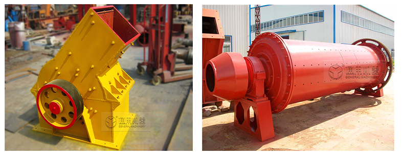 首先,100-200mm 的物料經(jīng)過錘式破碎機破碎成小塊(<15mm);然后,通過提升機提升到料倉,經(jīng)過自動給料機均勻送進高效球磨機內(nèi),經(jīng)過球磨機內(nèi)部鋼球與鋼球和襯板之間的研磨,達到細度要求的細粉經(jīng)過風(fēng)機的風(fēng)力作用,通過分析機進入集粉器,在集粉器中收集下來,將成品物料經(jīng)過打包后送往市場。