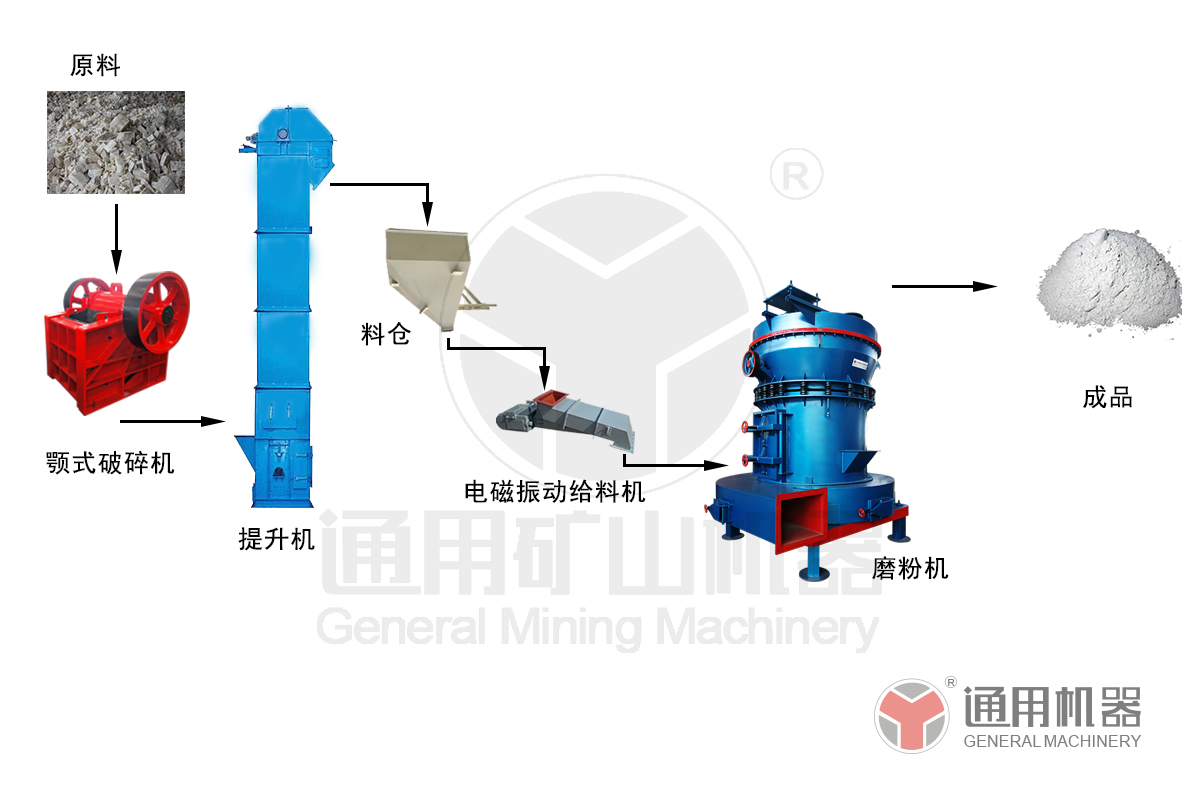 其工藝流程主要包括:大塊物料經(jīng)過破碎機,破碎成小塊物料, 經(jīng)由提升機提升到小料倉,通過電磁振動給料機均勻給料到磨粉機里面。經(jīng)過磨粉機研磨到200-500目。合格物料被風(fēng)機吹到磨機上方的分級機,并傳送到集粉器里面。由提升機提升到沸騰爐里面,經(jīng)過煅燒之后,再由提升機提升到成品料倉庫,配備雙嘴打包機和罐車,最終運送到目的地。