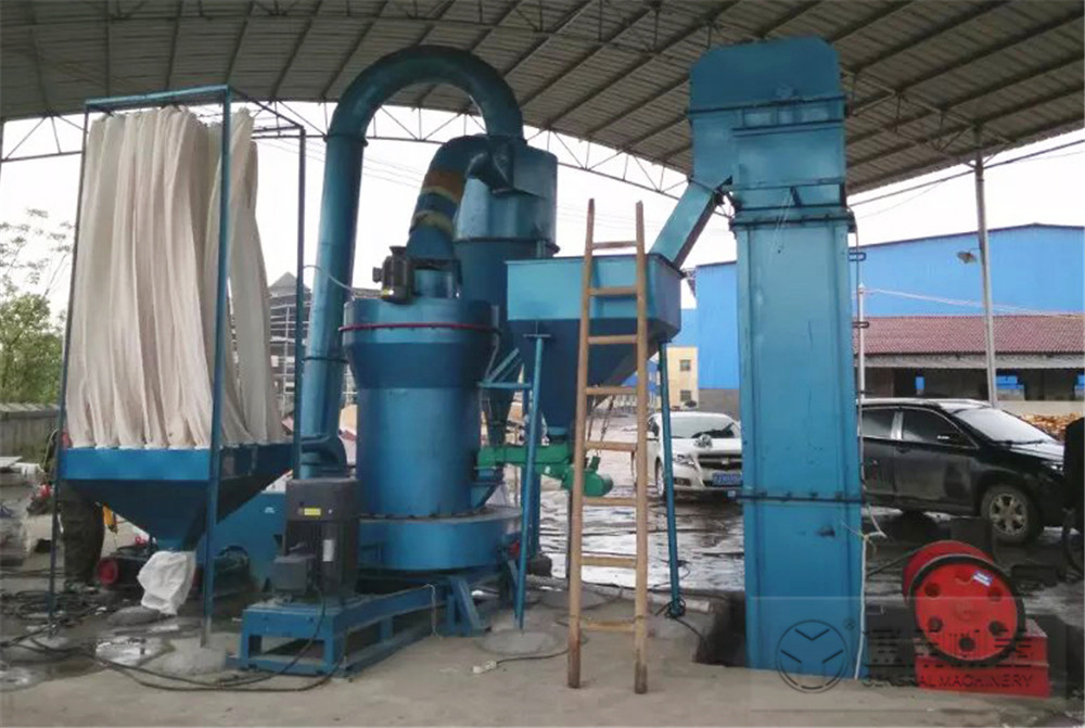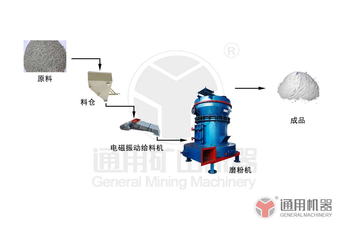 物料由鏟車(chē)進(jìn)料到原料倉(cāng),原料倉(cāng)的料再由下端的自動(dòng)給料機(jī),輸送至YGM85主機(jī)進(jìn)行粉磨,成品由集粉器送至打包機(jī)打包。
