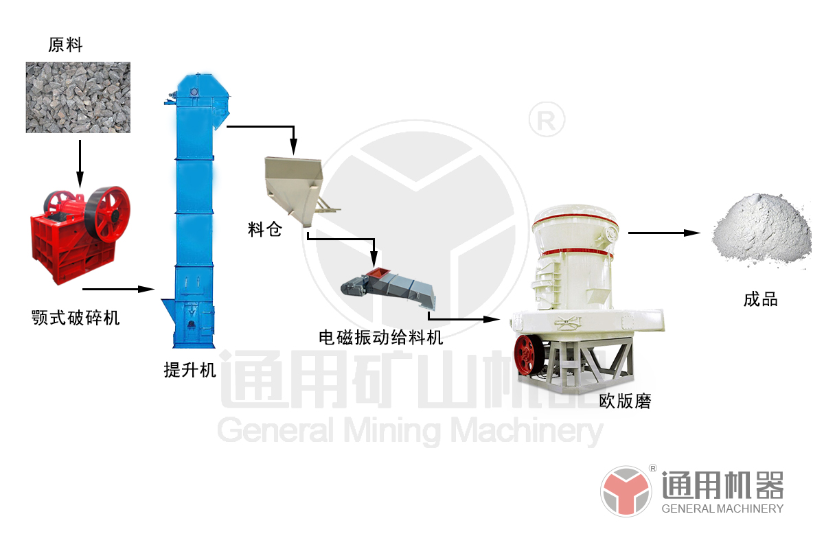 大塊物料經(jīng)破碎機(jī)破碎到所需粒度(30mm)后,由提升機(jī)將物料送至儲(chǔ)料斗,再由皮帶機(jī)將物料均勻定量連續(xù)地送入主機(jī)磨室MTW175磨粉機(jī)內(nèi)進(jìn)行研磨。粉磨后的物料被風(fēng)機(jī)氣流送入選粉機(jī)進(jìn)行分級(jí)。在選粉機(jī)葉輪的作用下,不符合細(xì)度要求的物料落入磨室內(nèi)重新碾磨;合格的物料則經(jīng)空氣斜槽進(jìn)入旋風(fēng)集粉器內(nèi),進(jìn)行分離收集,經(jīng)排料裝置排出即為成品粉體。整個(gè)過(guò)程屬于閉路循環(huán)系統(tǒng),并在正負(fù)壓狀態(tài)下運(yùn)行,配備以脈沖除塵器,保證了生產(chǎn)現(xiàn)場(chǎng)的干凈、整潔。